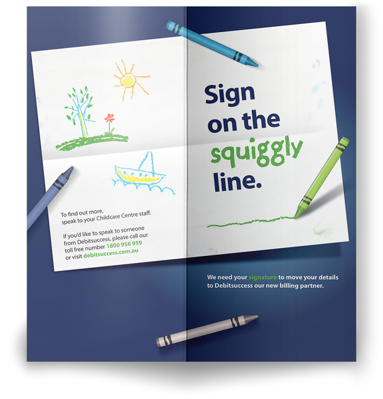 The concept that got the green light was the one that incorporated the most direct call-to-action to, “Sign on the squiggly line”. The idea of a squiggly line, locked in perfectly with childcare centres and their armies of crayon wielding munchkins.
